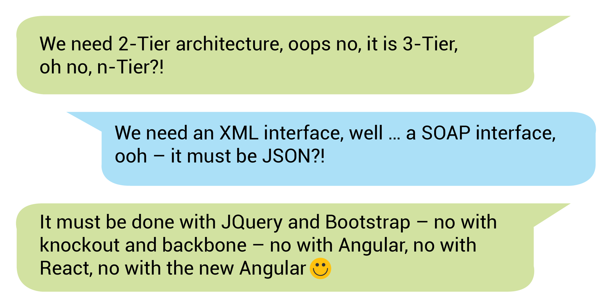 Yesterday our application had to be written in Java with Hibernate and web-enabled to reduce client installations or the Microsoft variant. And today it must be SaaS-enabled with multi-tenancy support, exposed as an open REST-based API with native Apps on top of that and oh yeah, we also need to play the platform game.