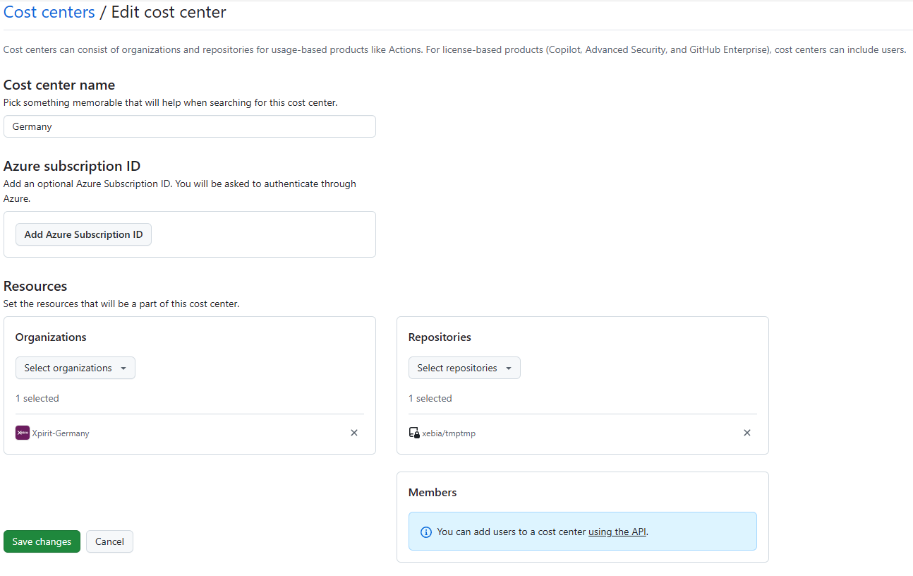 In the Enterprise Admin portal, you can assign Organizations and Repositories to Cost Centers. Members can only be assigned through the API.[/caption]