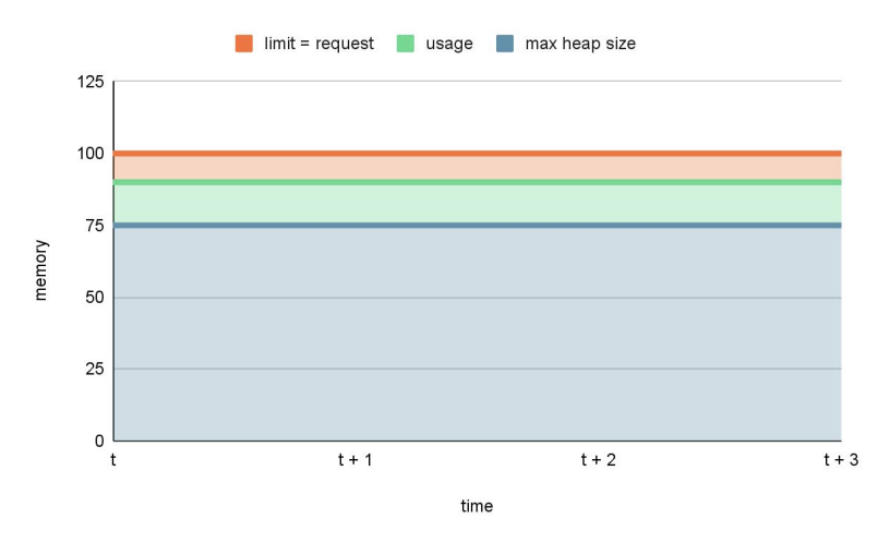 This is not good enough, so we can try to align requests and limits, and tweak the heap size.