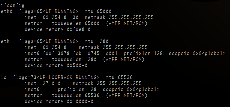 * There are two primary network interfaces, eth0 and eth1, of which eth1 has the default route and an IPv6 local address. The eth0 interface has a huge MTU of 65000 while eth1 is only 1280.