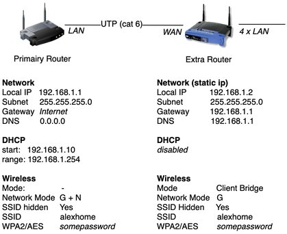 The standard firmware might have been sufficient for this use-case: routing traffic. But I chose to replace the factory default with DD-WRT, a Linux based OpenSource WLAN router firmware. Following their guide to set up the WiFi 'extension'. Actually, it is WiFi bridge-mode, because it’s using Layer-2 network routing.