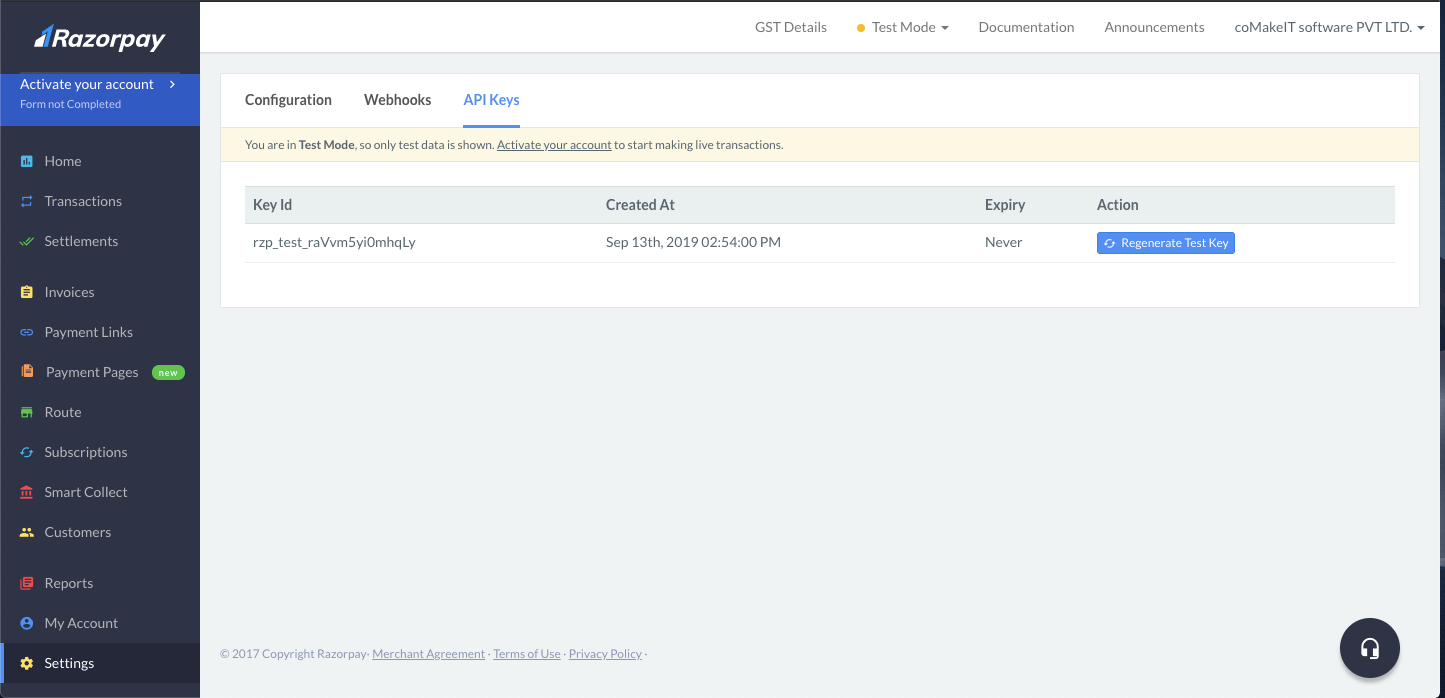 - Click on ‘generate test keys’ under Test Mode Enabled.