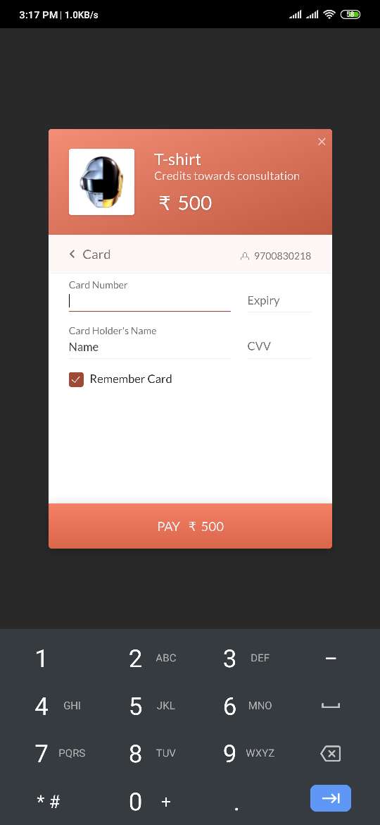 Select Card as payment method, and enter card information on the screen. We can go back from here to change payment method. Following are the various UI screens according to payment method selected.