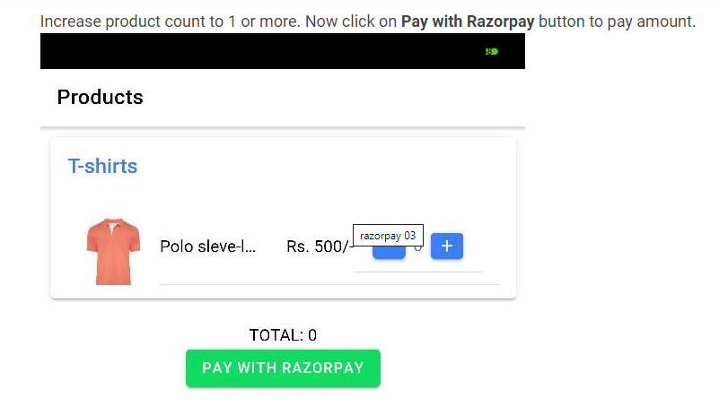 Increase product count to 1 or more. Now click on Pay with Razorpay button to pay amount.